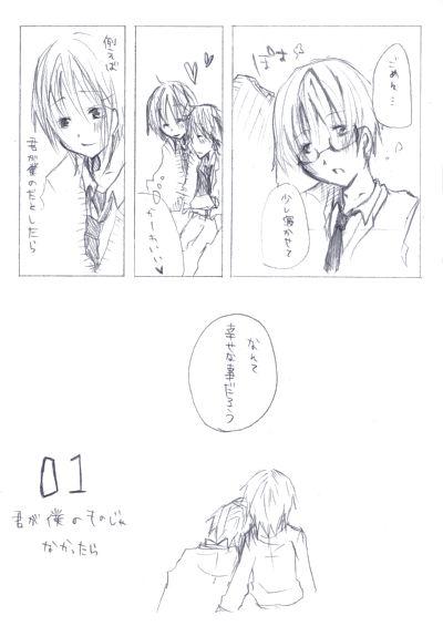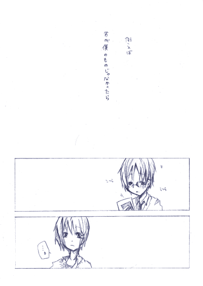 言っておくけど、希望が持てる話をしたいんだよ僕は。いけしゃあしゃあと唇を尖らせて文句を垂れた。眉毛を八の字に困った風に上目遣いで見上げてくる。その瞳の大きさ睫毛の長さ肌のきめ細やかさその小柄な体躯、こいつがふざけて言った「実は僕は女の子でした」ていうのも中々アリなのかもしれない。…想像したらちょっと(いやかなり)背筋が凍った。前言を撤回しておこう。